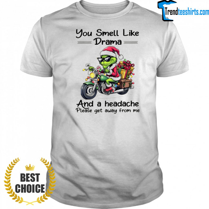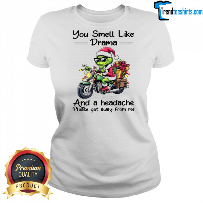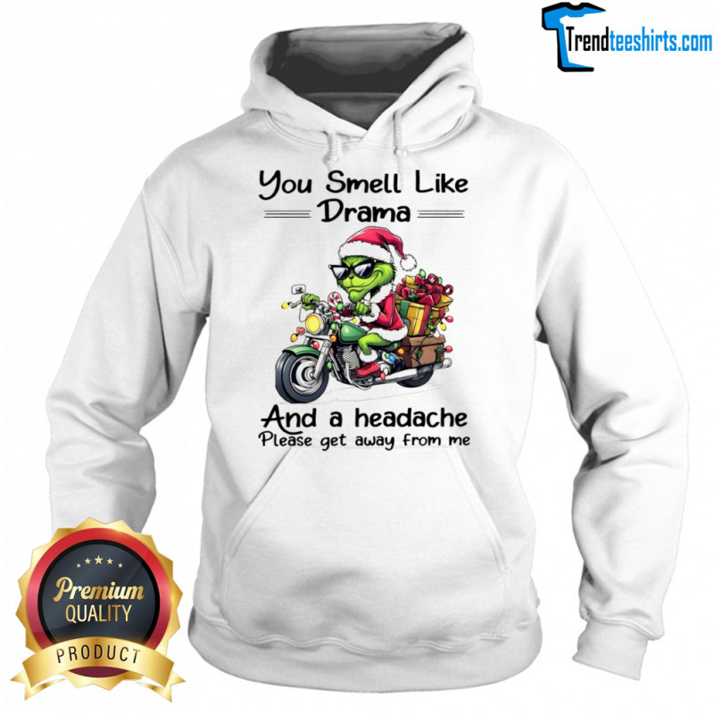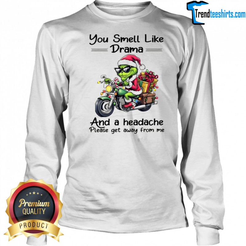 Buy Here: Funny Grinch Santa hat you smell like drama and a headache please get away from me Christmas shirt, hoodie, sweater, longsleeve and ladies t-shirt