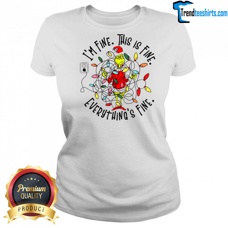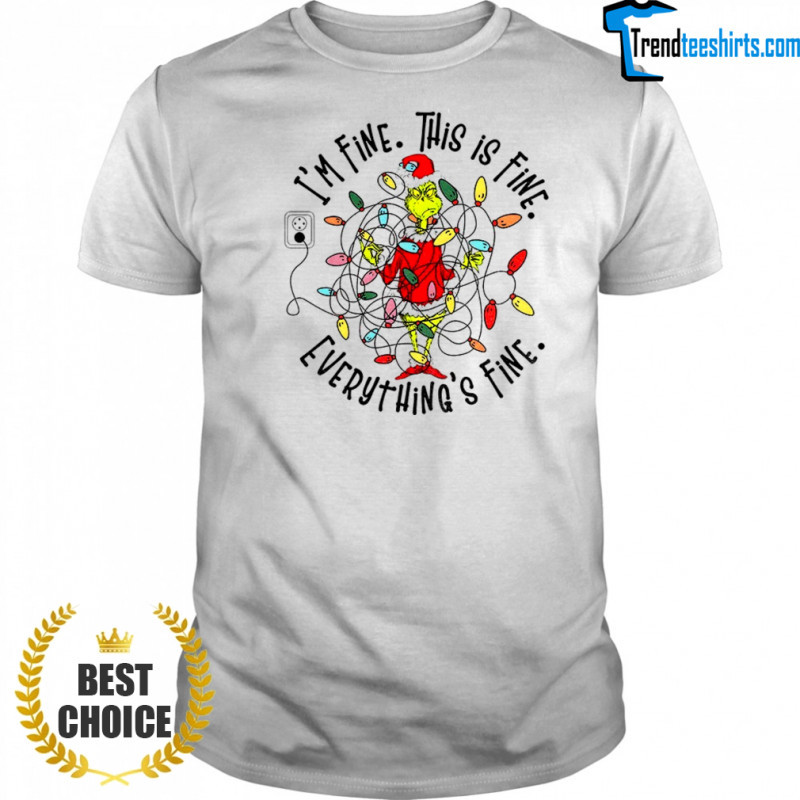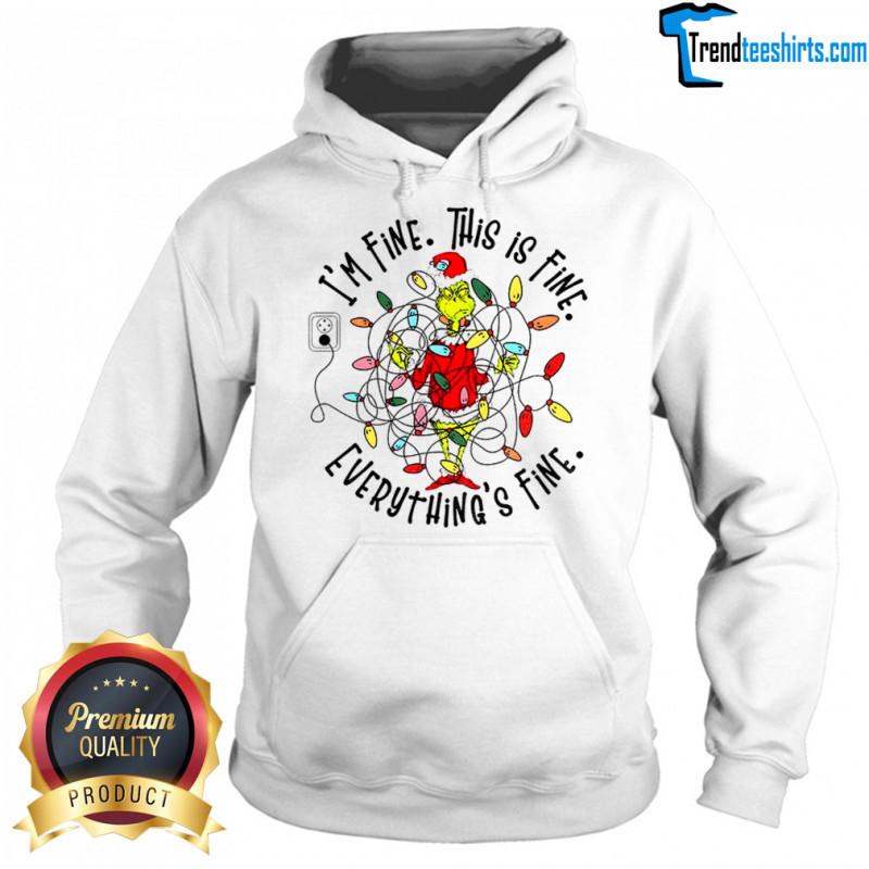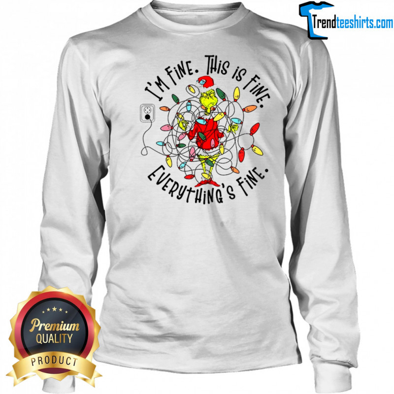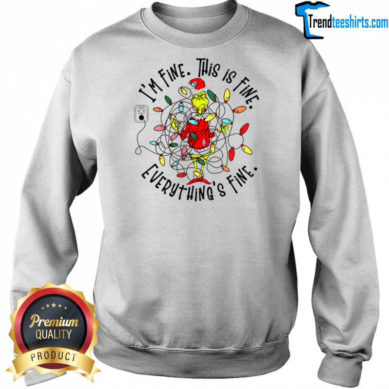 Buy Here: Grinch Santa hat I’m fine this is fine everything’s fine Merry Christmas shirt, hoodie, sweater, longsleeve and ladies t-shirt