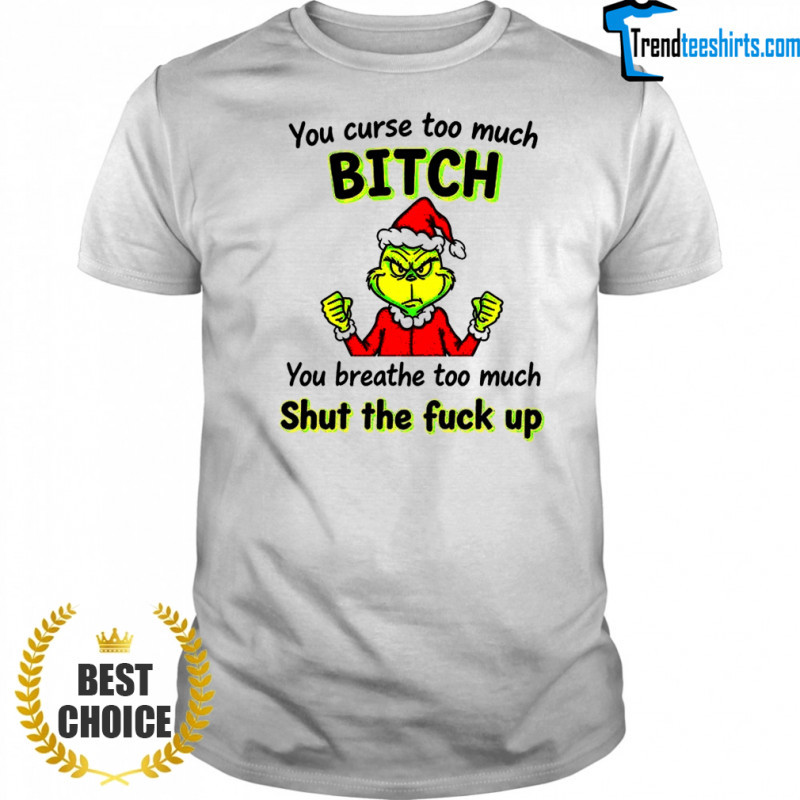 Celebrate the holiday season with a dash of humor and attitude in the Grinch you curse too much bitch you breathe too much shut the fuck up Christmas shirt. Embrace the festive spirit with a touch of sass and make a statement wherever you go. Crafted from premium, soft cotton, this shirt offers both comfort and style. The vibrant print featuring the iconic Grinch character adds a playful twist to your Christmas wardrobe. Whether you’re attending a cozy family gathering or a festive party, this shirt is sure to spark conversations and spread joy.